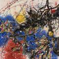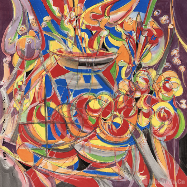 李曉柱的繪畫從1980年代開始,接續人物畫的漫長譜系,保留筆墨韻致,而加以大膽的現代性的變形,就是以欲望和寡淡的悖論感知拉長女性形體,如同馬蒂斯與常玉,并且置于男女的對峙與時代生命經濟的反諷之中。進入21世紀的彩墨系列《桃花渡》則把長型女性形體融入到桃花的紛紜之中,把具有現代單色繪畫感的暗淡黃色向著性感的紅色轉換,讓妖艷與鬼魅的色彩融入變形的形體,其琉璃閃亮的質感,把魔性、物性、還有自然的生長性,完美融合。來自于水墨與彩墨的感性融合力量,帶來了極端的絢爛與極致的妖嬈,徹底激活了來自于生命母體的柔和感知,讓藝術家可以接著實施更為徹底地轉向,即以水性丙烯顏料來畫帶有鮮明中國古典文脈主題的荷花與蓮花,但卻已經面目全非,因為記憶女神需要喚醒個體與文化的深度感應。