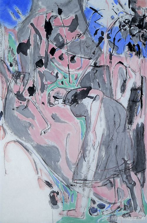 生長于白洋淀的藝術家自幼酷愛荷花,美好記憶的種子早就已經播下了。但不可能按照傳統方式去畫,在肯定現代性的欲望,甚至是紅色噴薄軀體的同時,還要使之融合到荷花的粉色花瓣與荷葉的青綠,還有荷梗的線條之中,甚至整個繪畫就是一滴滴荷葉上滑動的水珠,一起都是水,都是水線,都是水珠,都在絲絲牽纏之中,在欲斷又欲連之中,交織起來,滿福充滿,形成波波無盡的微妙振蕩。而之前的魔女形象則變得柔婉,宛若女菩薩或女神,經過水珠的洗滌而變得赤裸純潔,這是繪畫的洗滌,這是欲望的消融,這是《愛蓮說》的真意:“予獨愛蓮之出淤泥而不染,濯清漣而不妖?!比诵缘耐懽円呀洶l生。