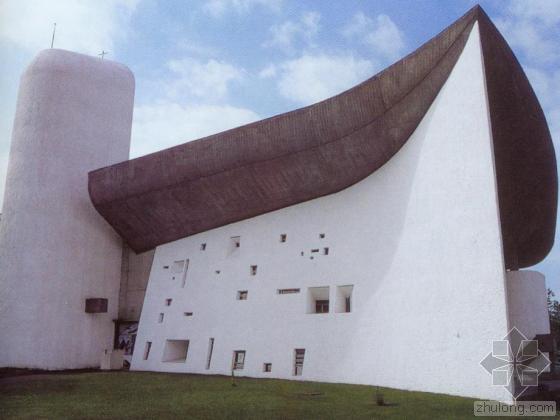 朗香教堂:造型奇特,墻體彎曲。主要空間的 周圍有三個小龕,每一個的上部都是 向上拔起的 “塔”。伸出于屋頂之外。各個立面的差別很大。以地中海民宅為思想來源,內部空間關系與萬神廟內大廳和周邊空間處理相似。它的建筑形體和空間證明柯布西耶具有非凡的想象力,也形象的反映出現代西方宗教的特質