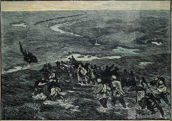 新中國成立后,抗戰精神在藝術創作中獲得了新的歷史維度和美學表達。四川版畫群體積極探索出“發揮集體智慧和個人獨創性”的創作模式。范樸與周琳合作的素描組畫《游擊健兒——抗日戰爭生活回憶》以飛揚靈動的炭筆線條、充滿動感的構圖,捕捉了游擊隊員機智果敢的戰斗瞬間。素描媒介特有的質樸與現場感,讓抗戰生活回憶變得鮮活生動起來。大型套色木刻《長征》組畫更具視覺沖擊力。其中,李煥民的《紅軍過草地》作為組畫之一,以深沉厚重的色調、凝練概括的造型,刻畫了紅軍艱苦卓絕的長征之路,將中華兒女主動肩負起抵御外侮的使命感、革命理想高于天的信念與紅軍將士的英雄氣概渲染得撼人心魄。這批集體創作的作品是對抗戰歷史進行的精神升華,藝術家將個體英雄壯舉融入民族解放的宏大敘事,奏響了時代強音。