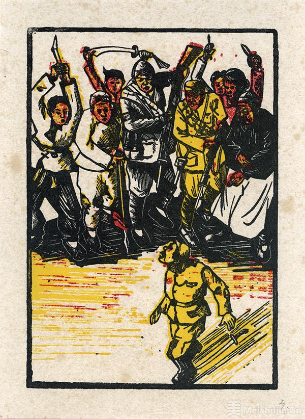 中國人民抗日戰爭是近現代以來中國人民反抗外敵入侵持續時間最長、規模最大、犧牲最大的民族解放斗爭。民族危亡關頭,一群具有進步思想和革命理想的美術家們積極投身創作,形成了獨特的戰時美術——左翼木刻。這些版畫作品被印在傳單上、報紙里、墻報中,成為那個時代的“匕首”與“投槍”,投入了一場關乎民族存亡的戰斗。組畫《地雷戰》便誕生于這一時期,李少言以高超的現實主義造型力,采用紀實的視角,讓每一幅小畫自己發聲。當指尖觸到那些凹凸印痕,當呼吸與畫中人的喘息同步,觀眾似能聽見民眾的怒吼、聞到抗戰的硝煙、感受大地的震顫。投身革命隊伍的牛文深入前線,以自己的所見所聞創作出木刻組畫《晉綏抗戰風云錄》,紅黃色調賦予畫面強烈的視覺沖擊,再現了晉綏邊區的場景和故事。這批左翼木刻既是揭露戰爭殘暴的銳器,亦是喚醒民眾的號角,其藝術價值與歷史價值已渾然一體。