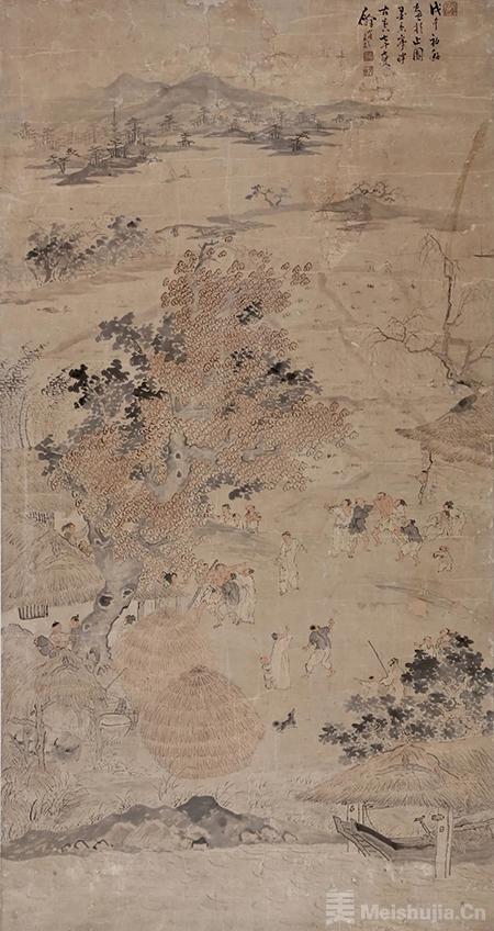 清代謝彬所繪《鄉村風俗圖》,則似一首充滿煙火氣的“勞作謠”,以寫實筆觸還原農忙百態:近景樹木枝葉繁茂,掩映著錯落的茅草屋,堆疊如山的草垛盡顯豐足之象,牛棚中耕牛稍作歇息。村內人頭攢動,一派熱鬧景象。田間,農人彎腰弓背,專注地收割作物。遠處山巒云霧繚繞,以自然的靜謐襯托人間的熱鬧,意境深遠。
