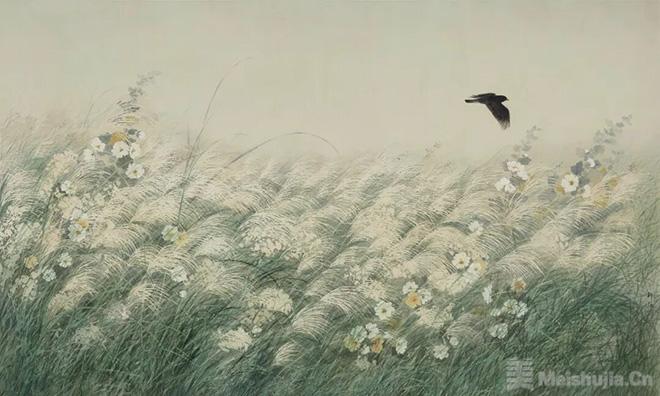 如今落筆:廣漠天地下,蔓草鋪陳,雜花遍野,看似幽寂的畫面之下卻涌動著難以抑制的蓬勃生機。唯有一只玄鳥正欲飛出畫面……