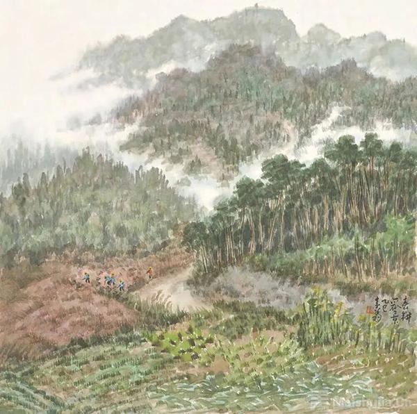 這位曾執掌解放軍藝術學院的教授、如今身居中國美術家協會副主席的藝術家,筆下從無劍拔弩張的激烈,反倒常以“水、云、山、田”為骨,將人間煙火悄然藏進墨色深處。他畫南方山水,不刻意摹寫奇峰險壑,偏愛捕捉尋常景致里的詩意:或許是春雨后斜倚田埂的竹,或許是暮色中飄著炊煙的木舍,又或許是云霧里若隱若現的黛瓦,恰似陶淵明“采菊東籬下”的閑逸,于樸素處見真味。